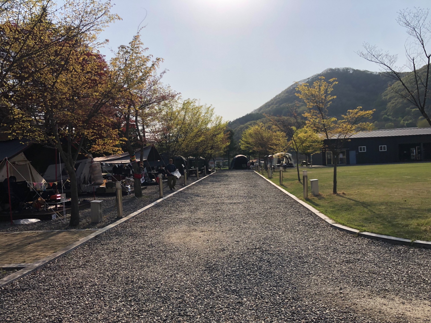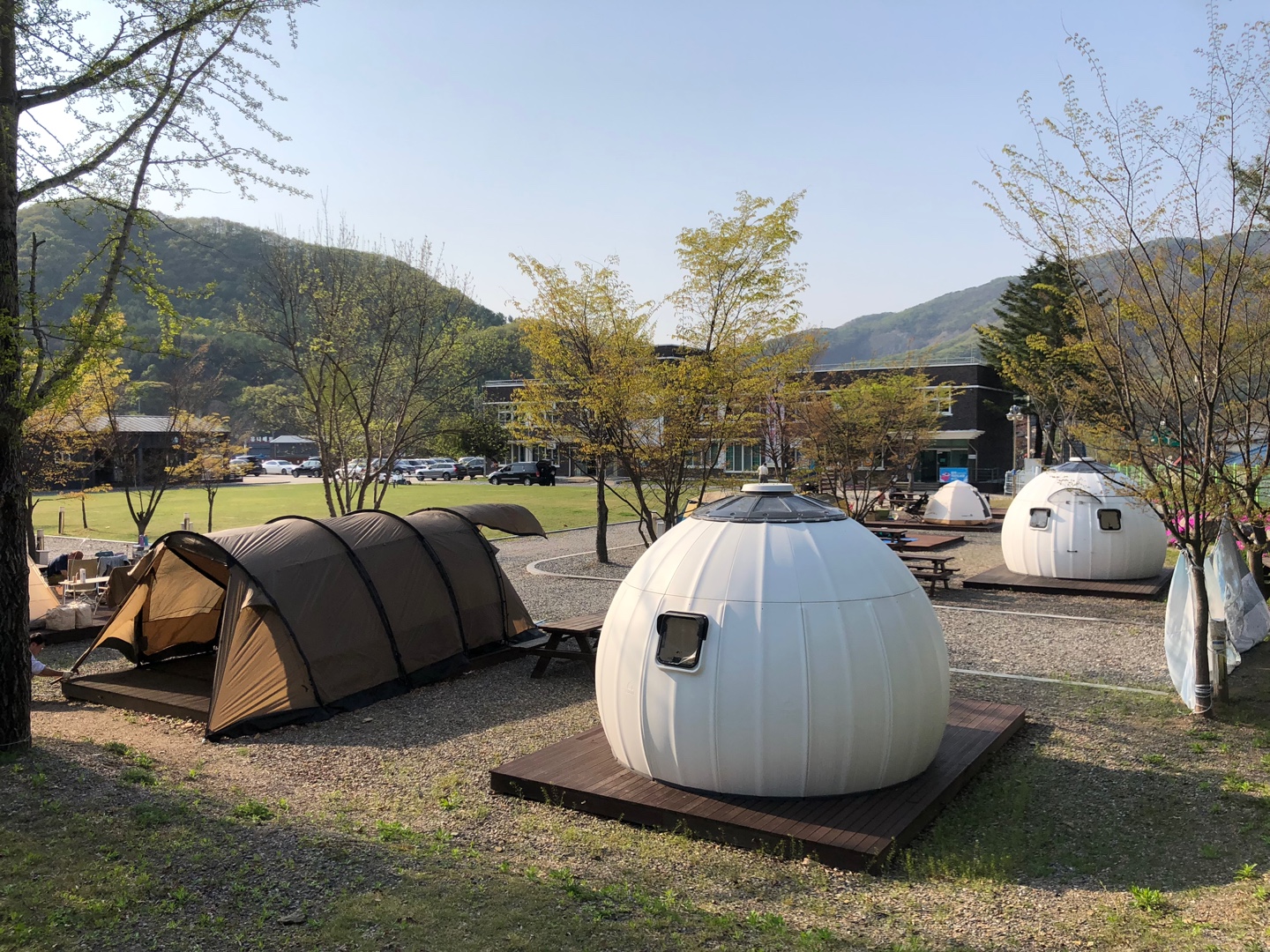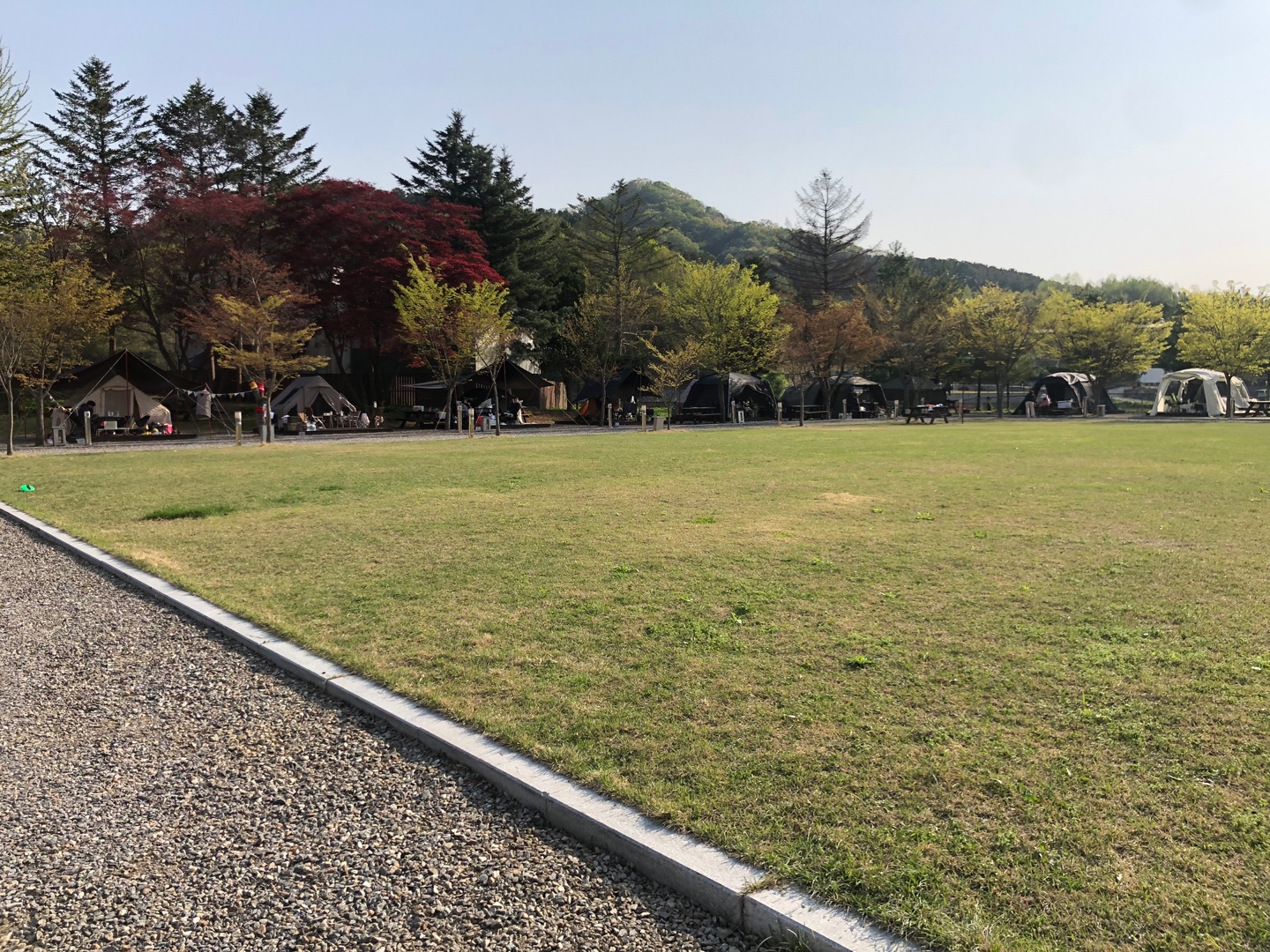 캠핑장의 구조도 인상적입니다. 넓은 잔디 운동장을 중심으로 텐트가 둘러져 있어