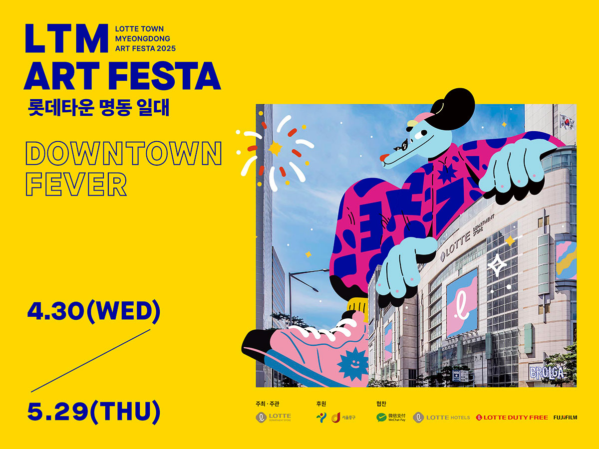 롯데백화점 본점을 중심으로 을지로입구역부터 롯데호텔 서울 광장까지 이어지는 명동 일대는 이번 페스타 기간 동안 다양한 예술 작품과 체험형 콘텐츠로 가득 채워집니다. 특히 호주 출신 아티스트 '브롤가(Brolga)'가 디자인한 캐릭터 '스티지(STEEZY)'가 8m 높이의 벌룬 조형물과 5m 크기의 공중 설치물로 등장하여 도심 속 미술관의 분위기를 연출합니다.