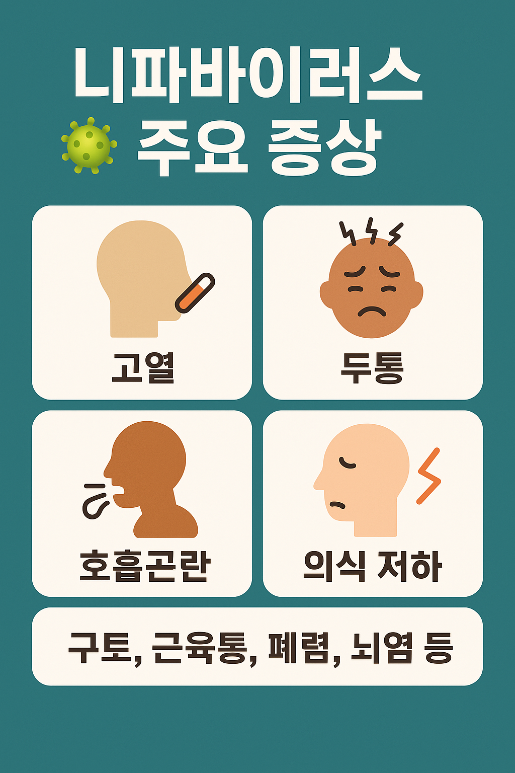 - 감염 증상: 고열, 두통, 구토, 의식 저하, 호흡곤란, 뇌염 등